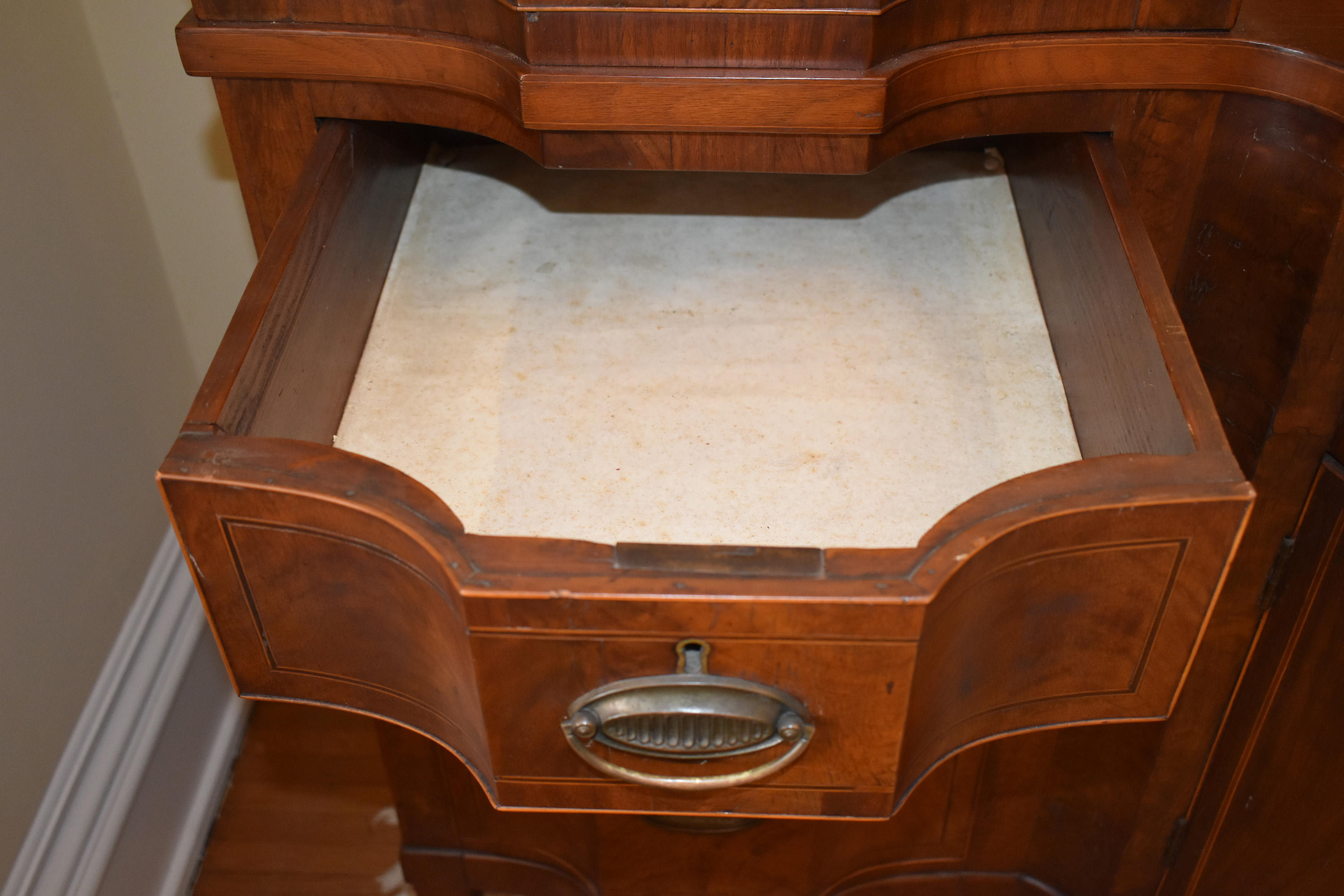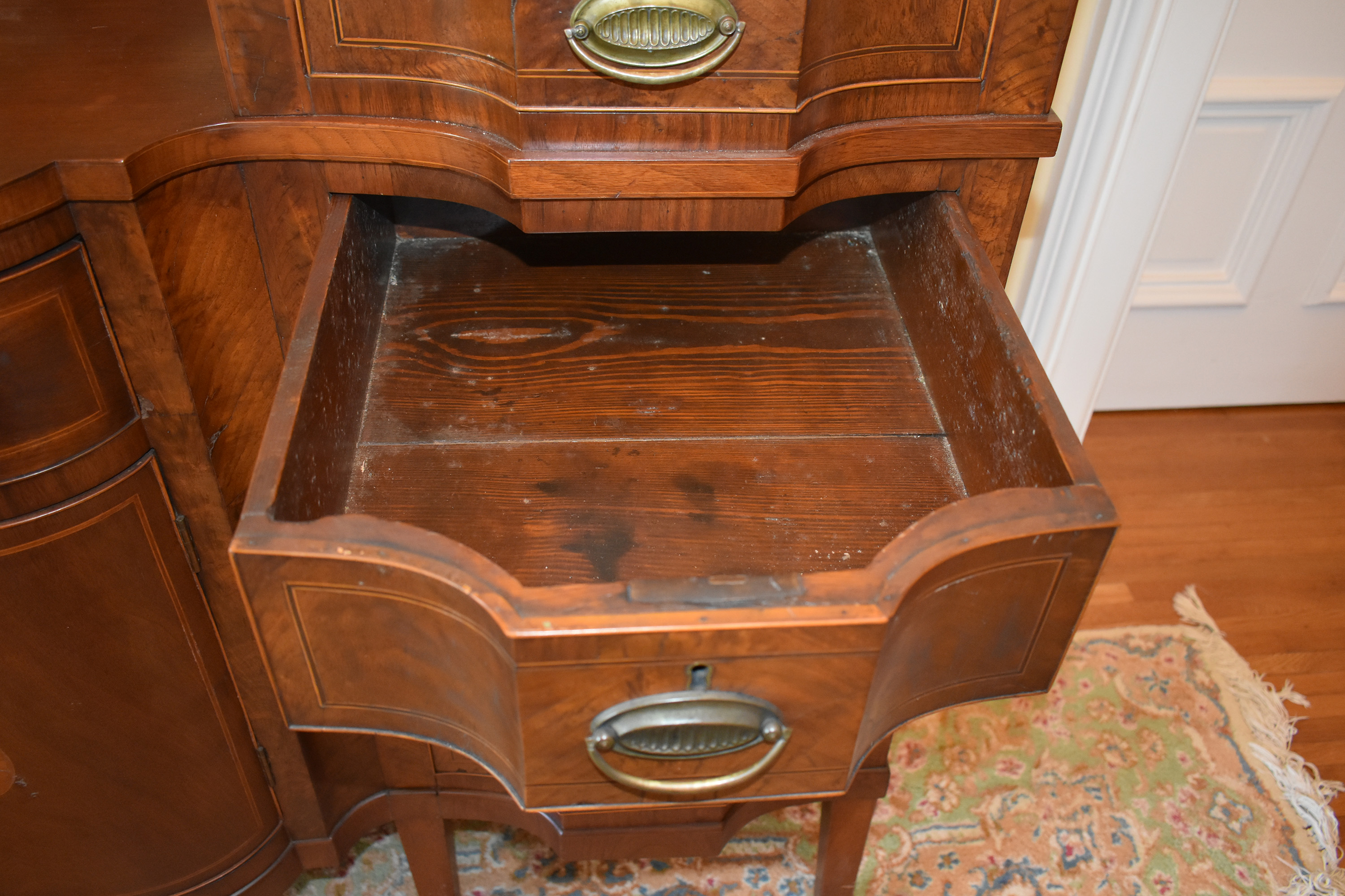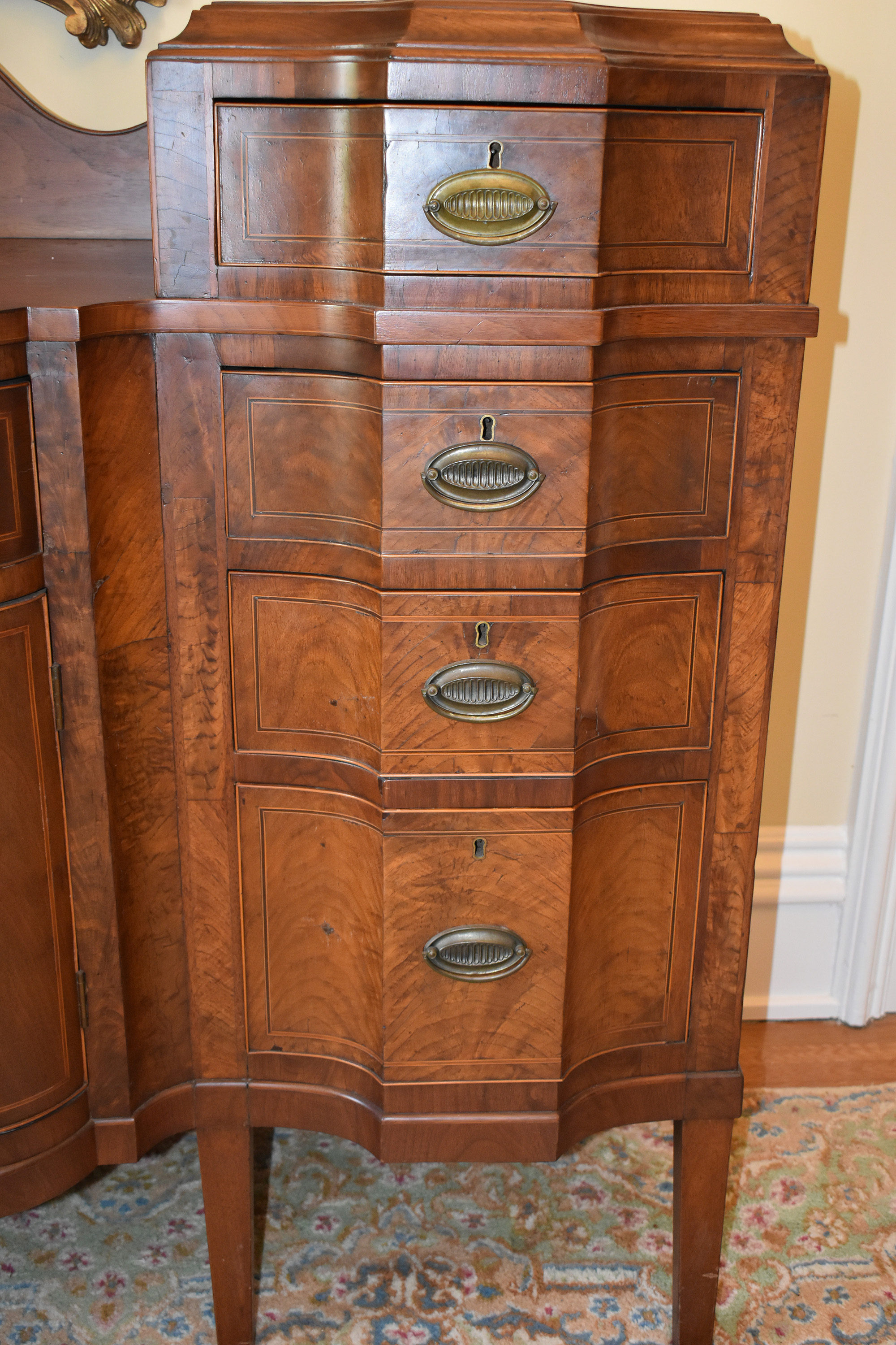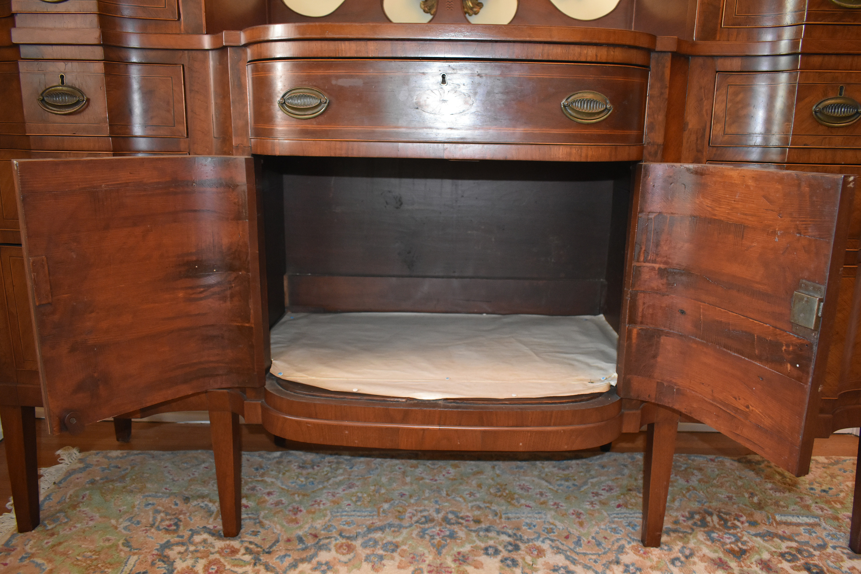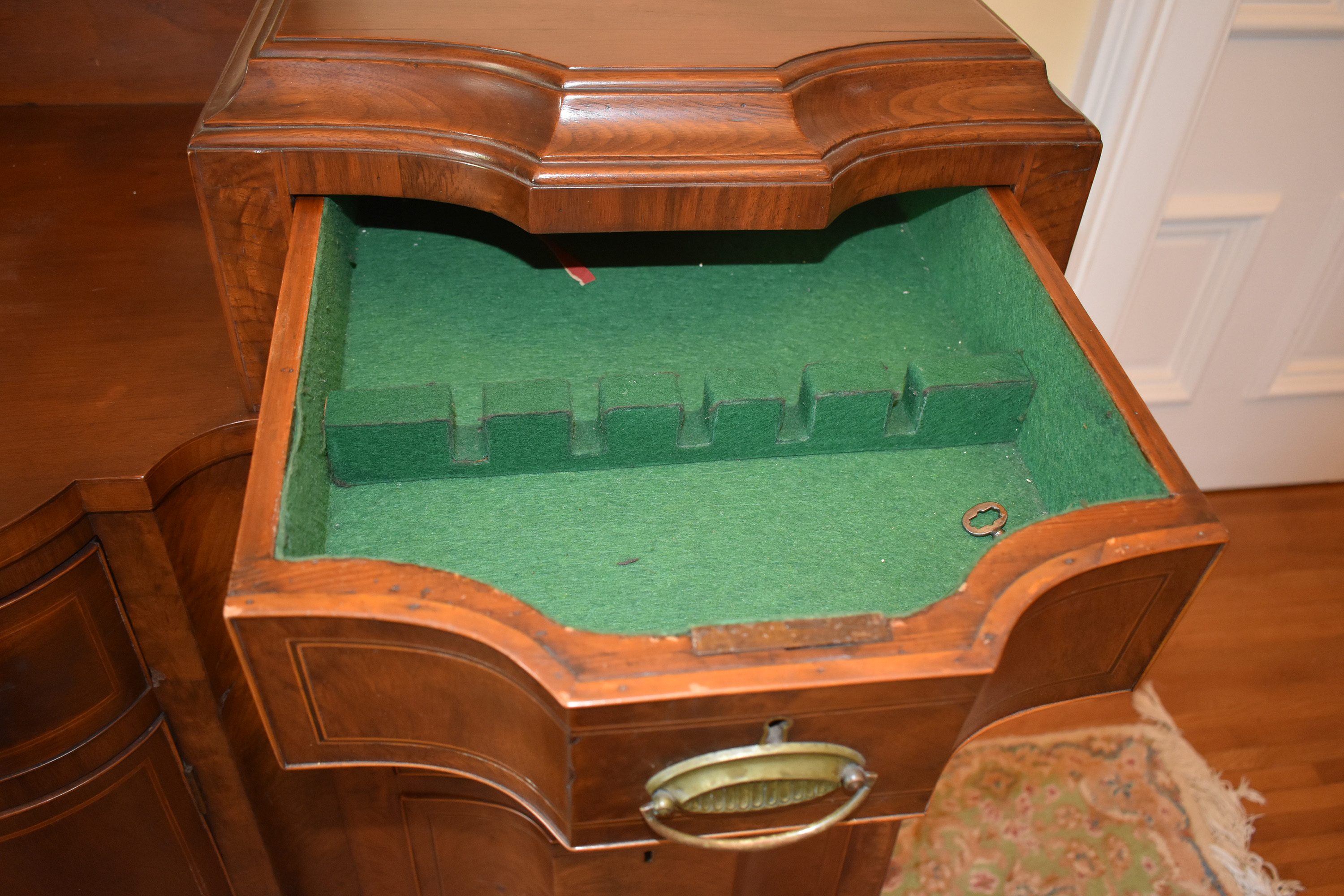 We have recently acquired a most desirable piece in this Walnut Veneered example with Pine Secondary wood. This example is pictured in the 1931 work: Southern Antiques by Paul H. Burroughs. The veneer pattern on the door fronts match the photo in the book. The piece has two curved doors with a curved central drawer, all with inlay work, with the left and right side banks of drawers beginning at the top with a felt-lined silver drawer and ending at the bottom in large cellarettes. Measurements are 49″ tall by 71-3/4″ wide, by 24-1/4″ deep. 8 tapered legs support the piece. Additional inlay work is found on the backsplash with two carved medallions on the top.