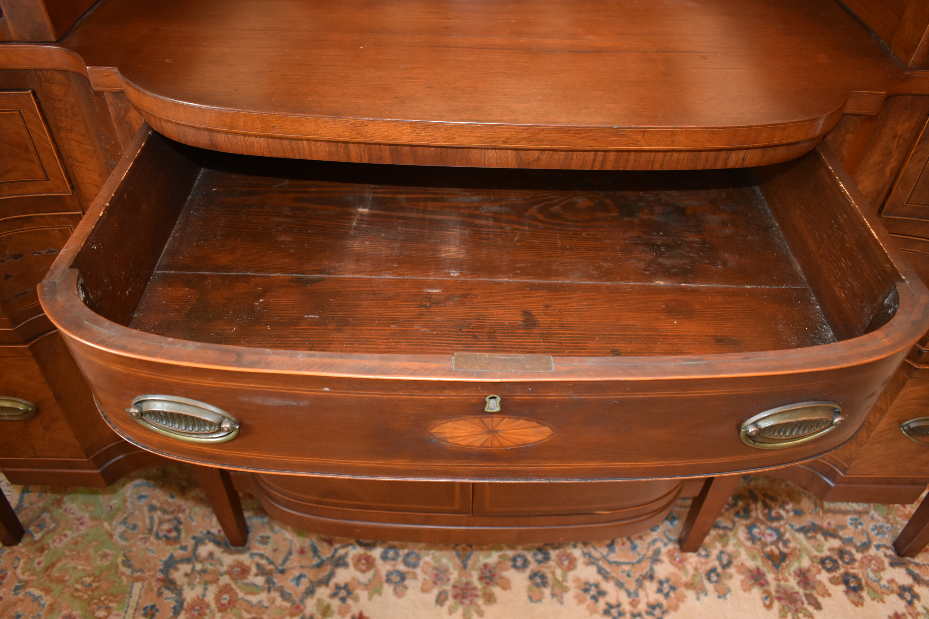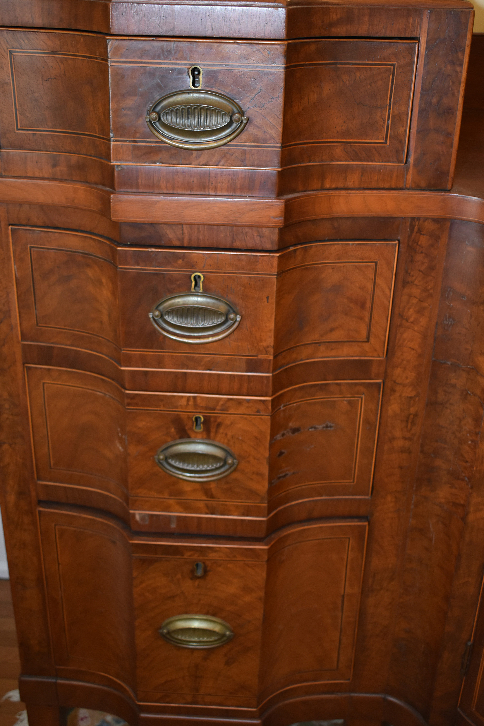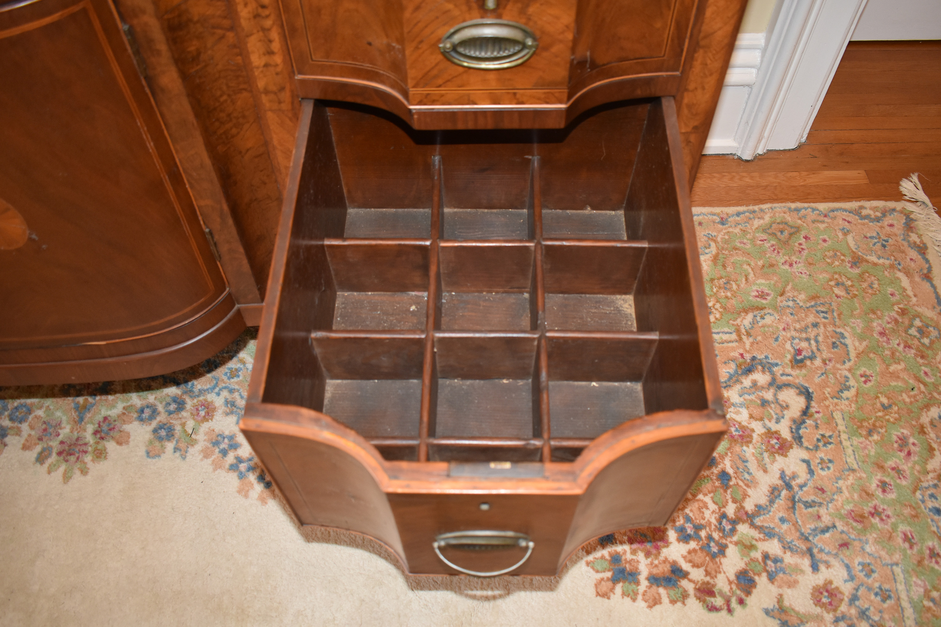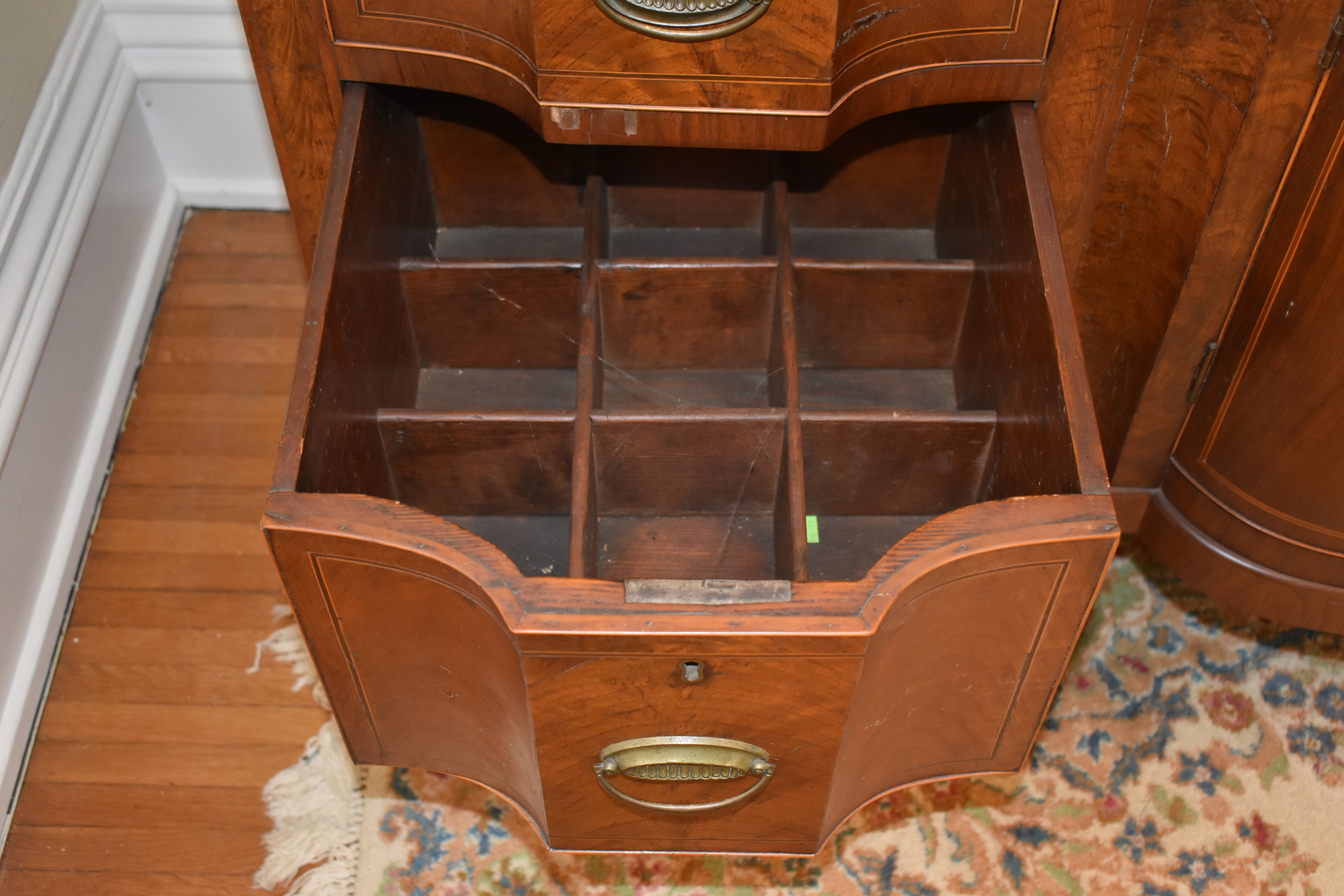 We have recently acquired a most desirable piece in this Walnut Veneered example with Pine Secondary wood. This example is pictured in the 1931 work: Southern Antiques by Paul H. Burroughs. The veneer pattern on the door fronts match the photo in the book. The piece has two curved doors with a curved central drawer, all with inlay work, with the left and right side banks of drawers beginning at the top with a felt-lined silver drawer and ending at the bottom in large cellarettes. Measurements are 49″ tall by 71-3/4″ wide, by 24-1/4″ deep. 8 tapered legs support the piece. Additional inlay work is found on the backsplash with two carved medallions on the top.