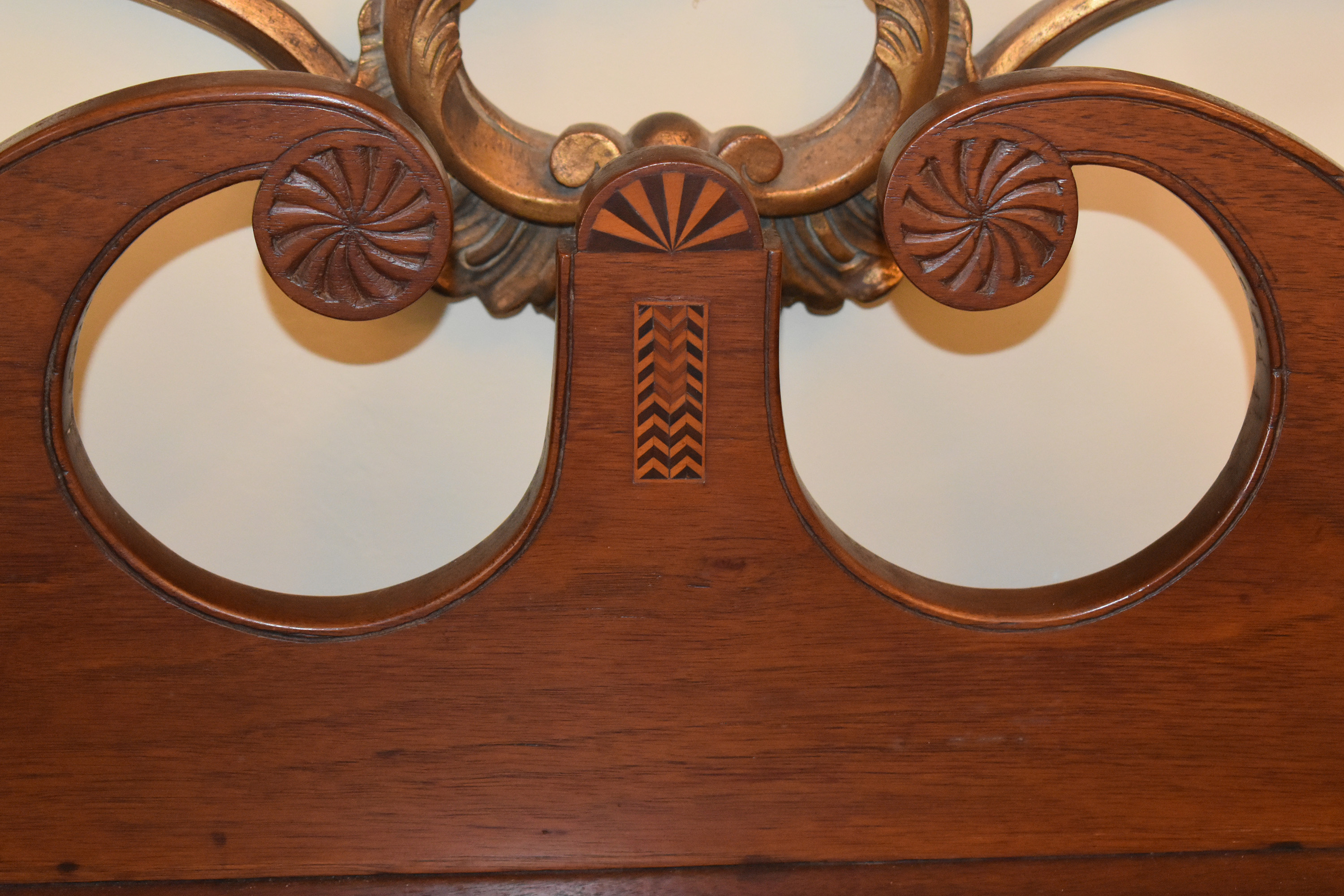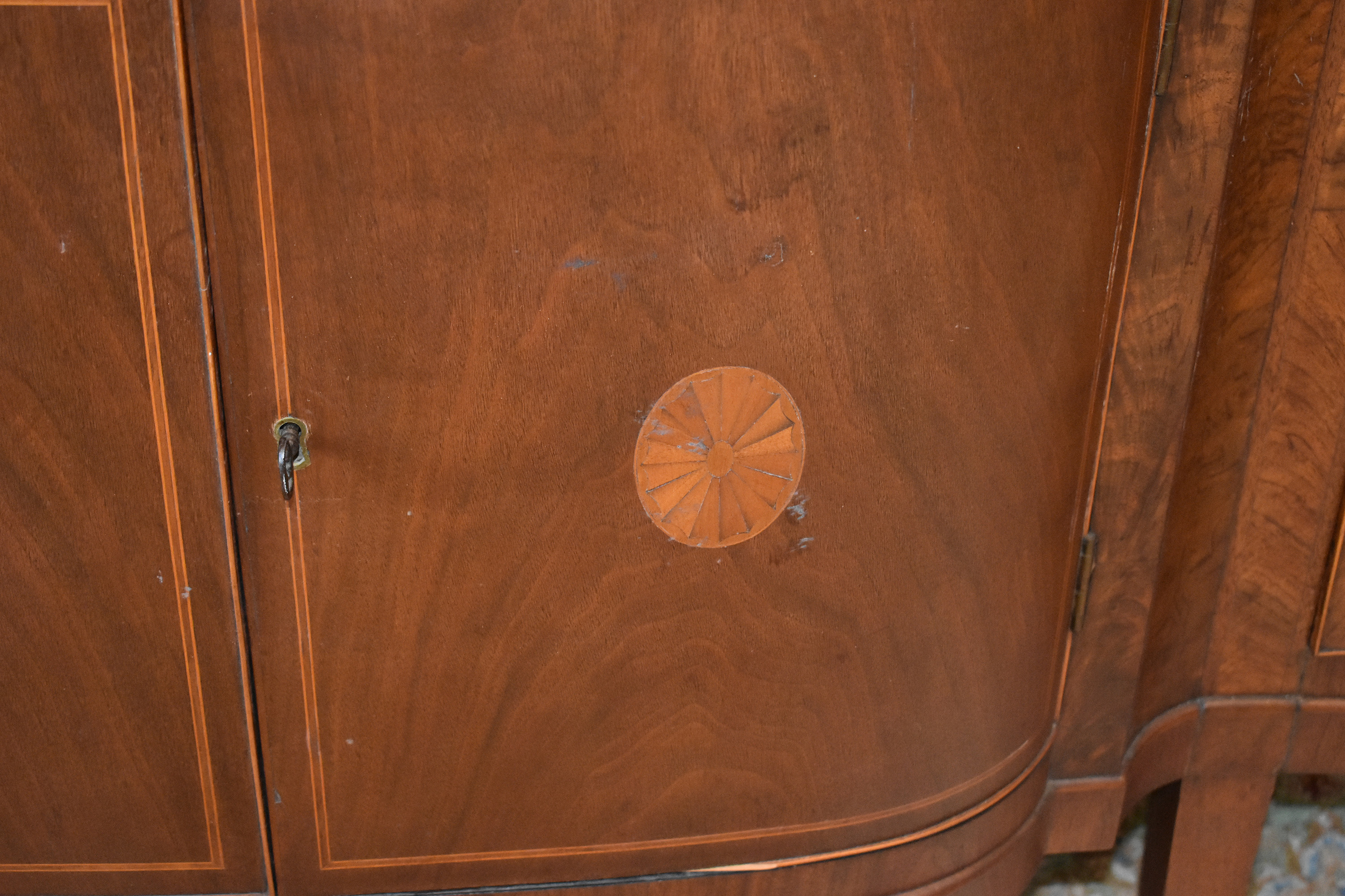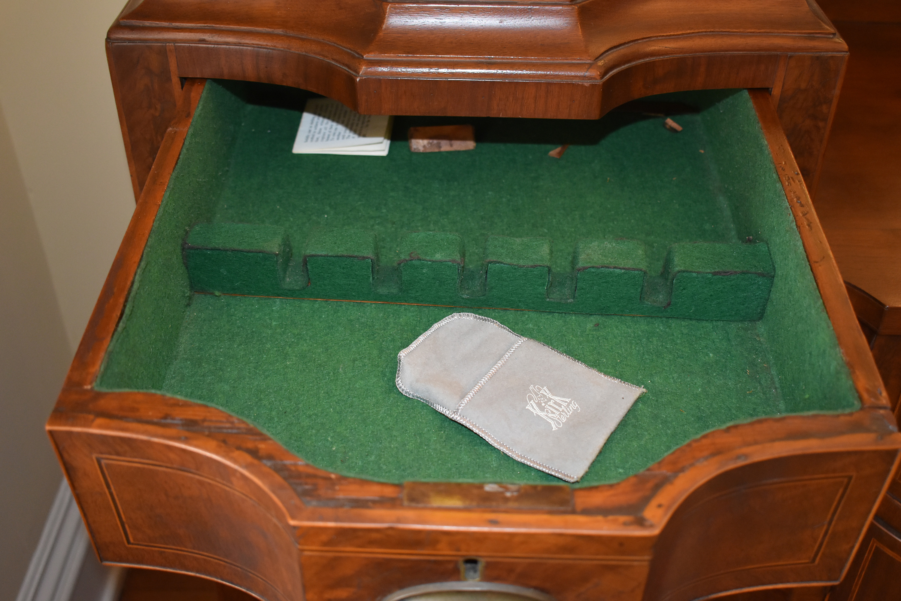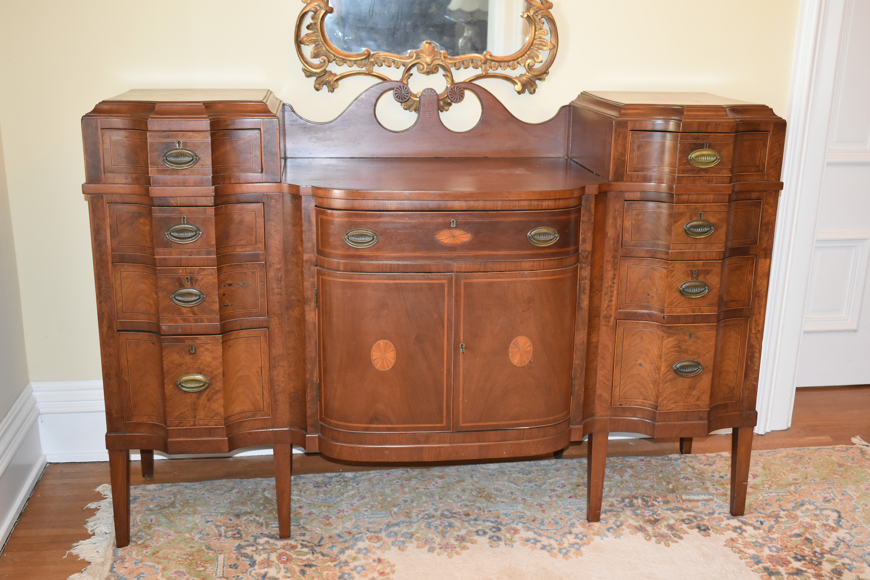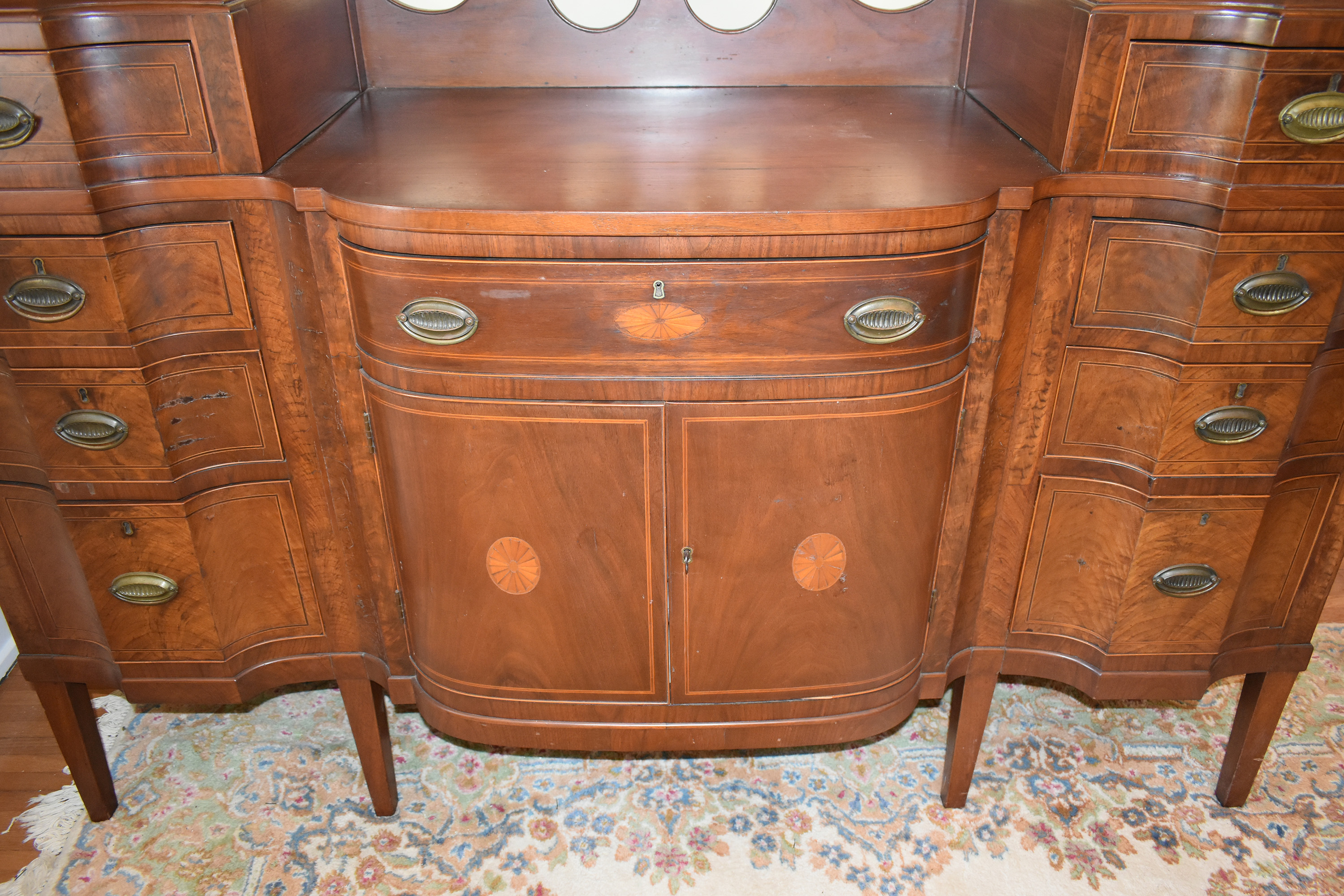 We have recently acquired a most desirable piece in this Walnut Veneered example with Pine Secondary wood. This example is pictured in the 1931 work: Southern Antiques by Paul H. Burroughs. The veneer pattern on the door fronts match the photo in the book. The piece has two curved doors with a curved central drawer, all with inlay work, with the left and right side banks of drawers beginning at the top with a felt-lined silver drawer and ending at the bottom in large cellarettes. Measurements are 49″ tall by 71-3/4″ wide, by 24-1/4″ deep. 8 tapered legs support the piece. Additional inlay work is found on the backsplash with two carved medallions on the top.