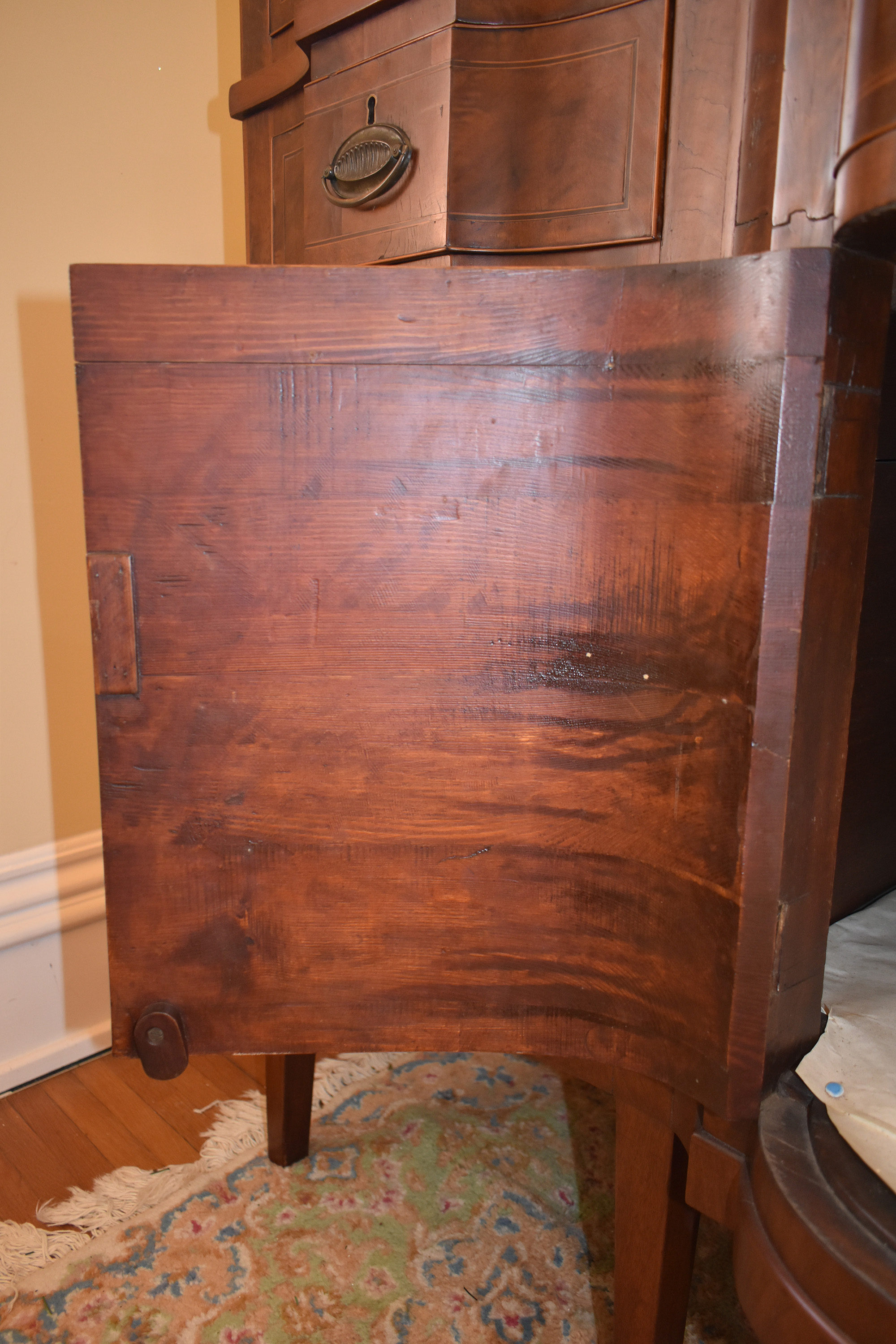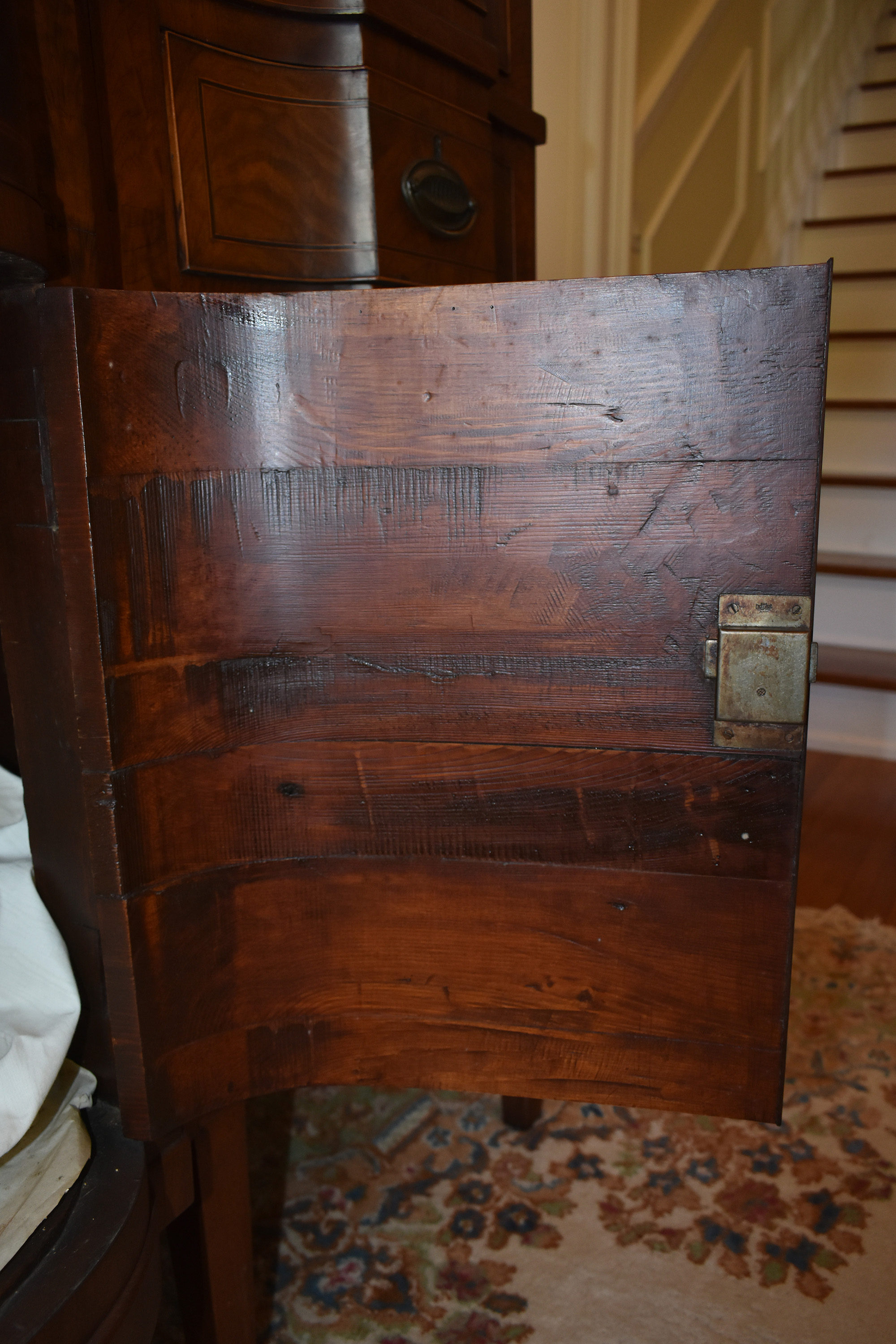 Our review of the piece by local antique furniture experts suggests an alternative. Several experts have strongly suggested that this piece is in fact the work of noted Fayette County cabinetmaker Robert Wilson, who was an Englishman who arrived in Fayette county around 1792 and soon begin a partnership with Porter Clay in late 1807- famous Kentuckian Statesman Henry Clay’s brother. In January of 1808, however, notice was given that the partnership was dissolved…Porter Clay writes of Wilson: