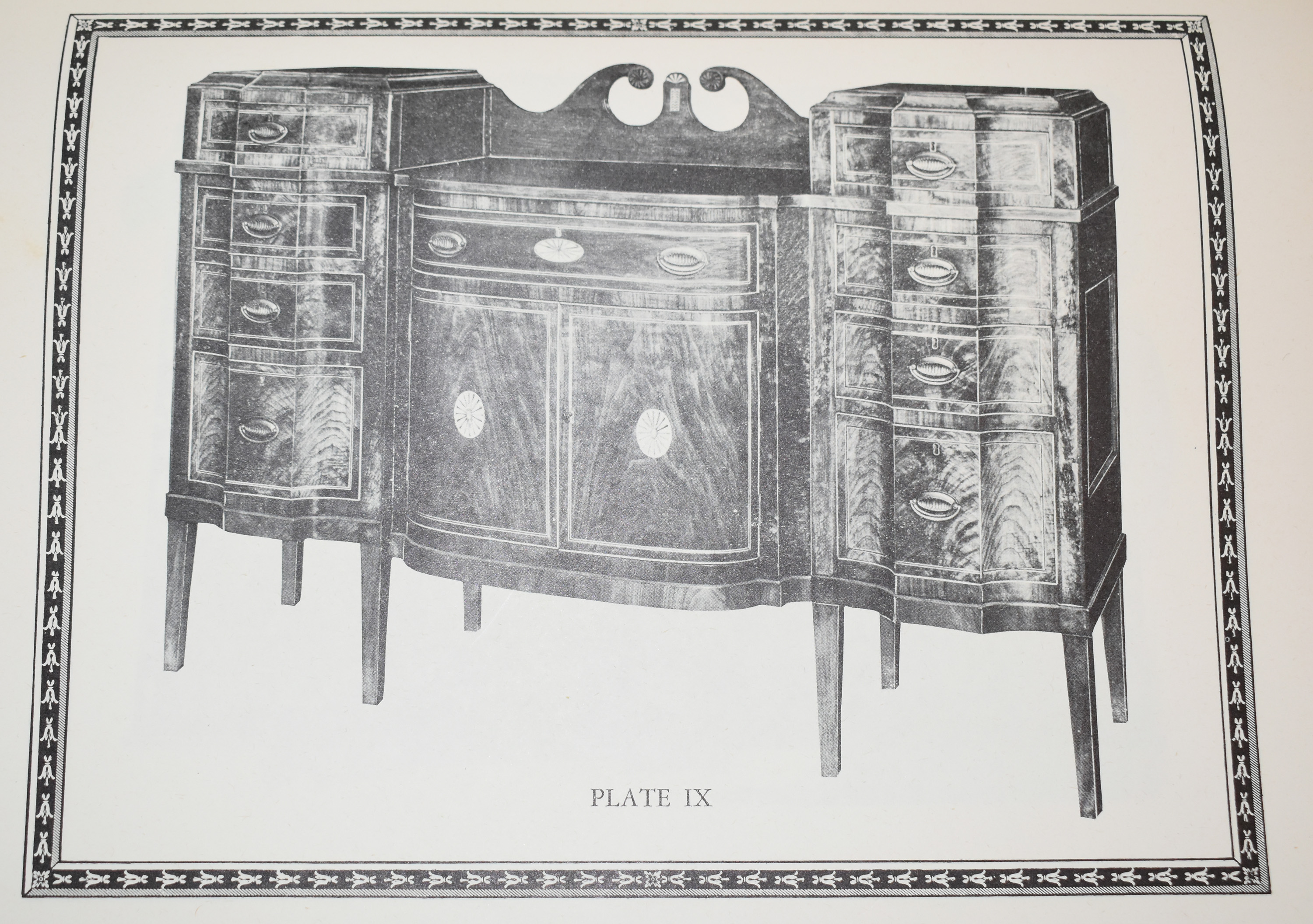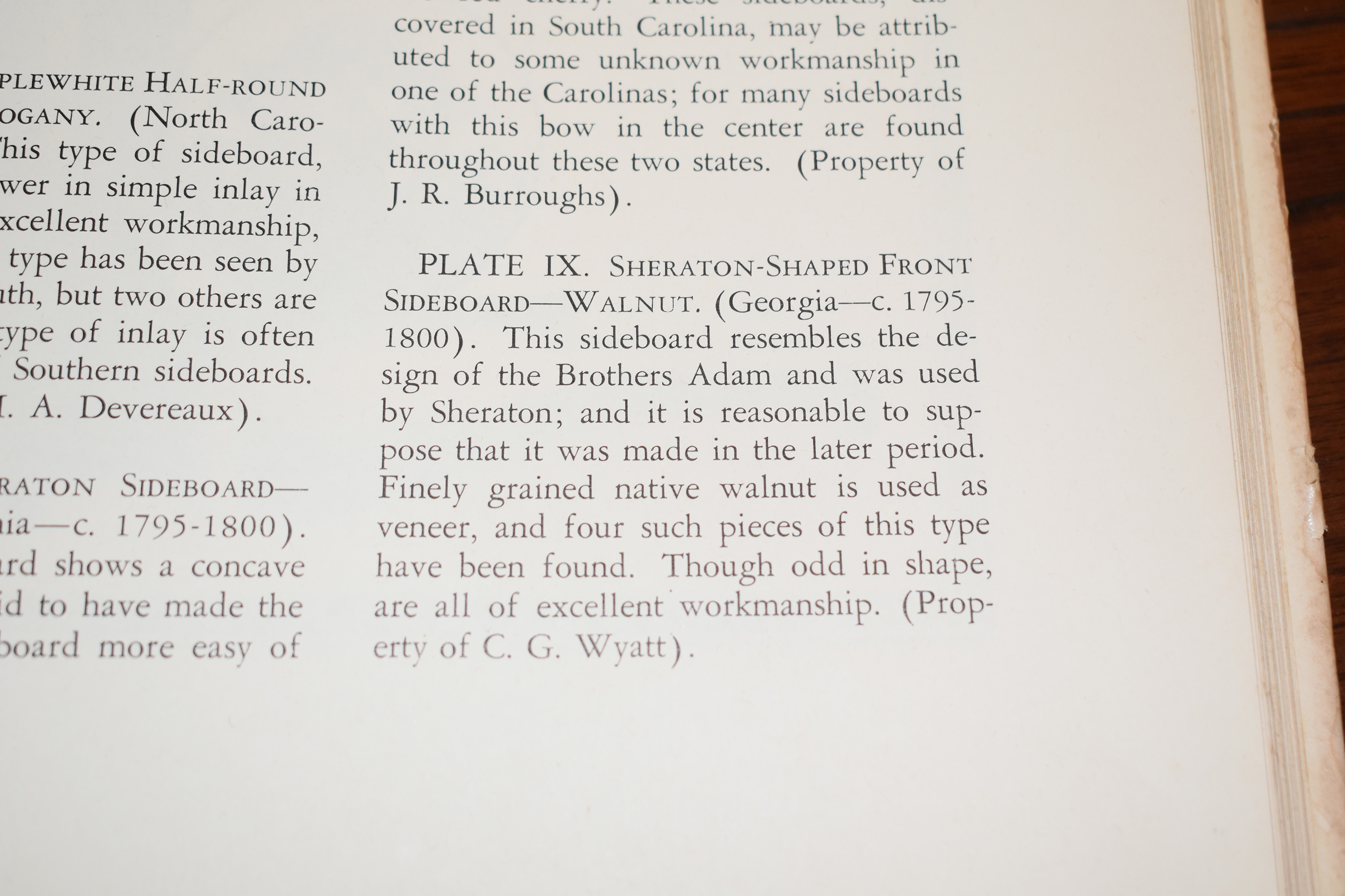 PLATE IX. Sheraton-Shaped Front Sideboard – Walnut (Georgia – C. 1795-1800). This sideboard resembles the design of the Brothers Adam and was used by Sheraton; and it is reasonable to suppose that it was made in the later period. Finely grained native walnut is used as veneer, and four such pieces of this type have been found. Though odd in shape, are all of excellent workmanship. (Property of C.G. Wyatt)