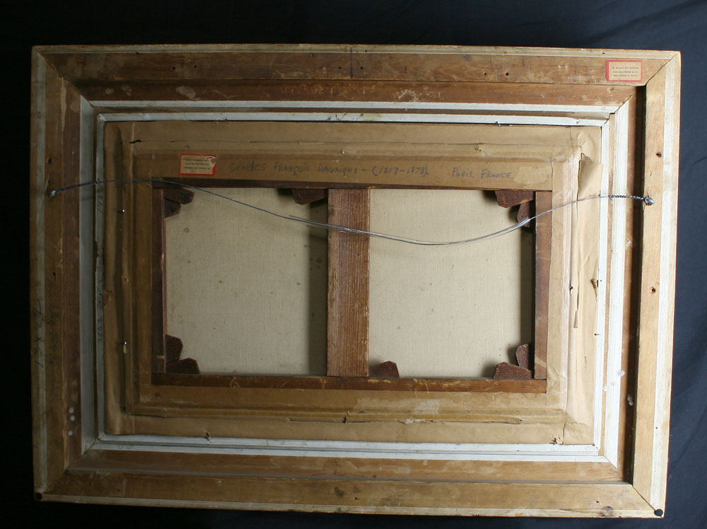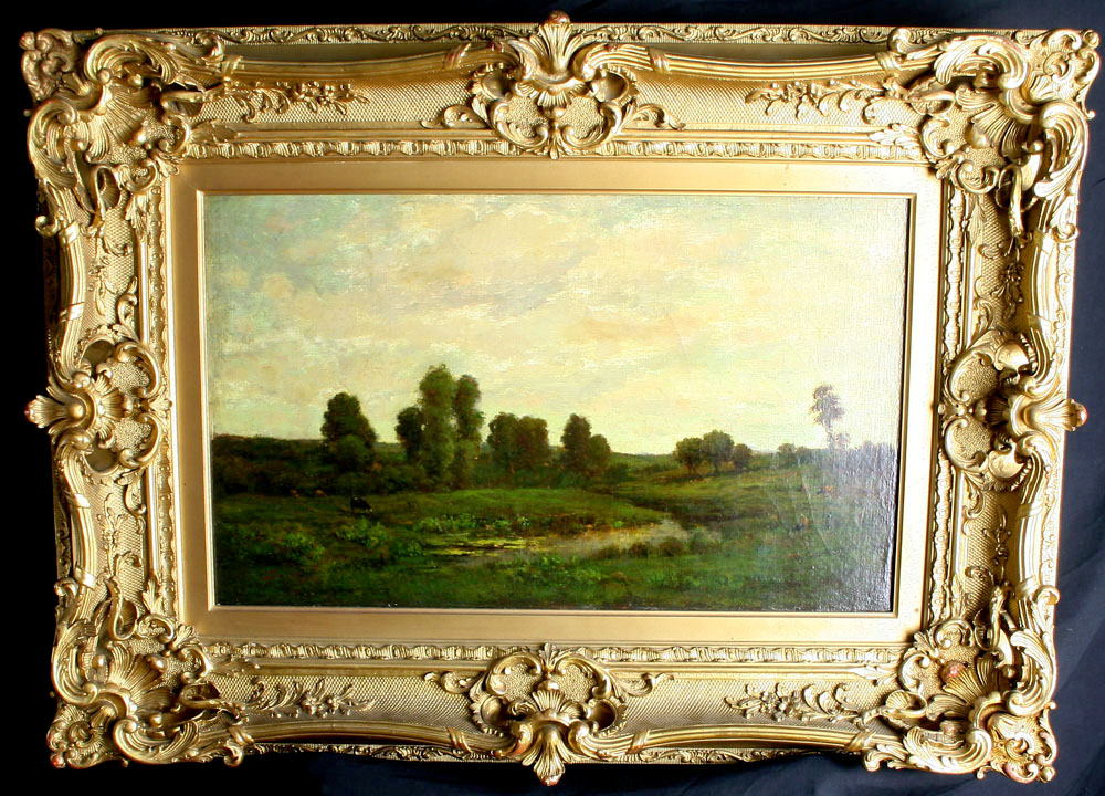 Highly ornate original ‘Gallery Presentation’ style Gesso with Gold Leaf frame with original wooden stretcher. 23″ X 31-1/2″